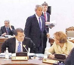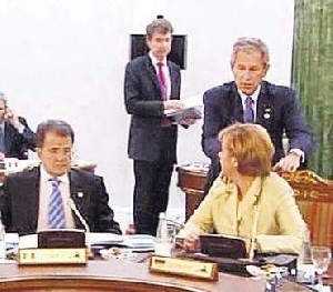 Chancellor Angela Merkel is speaking with Italy’s Prime Minister Romano Prodi — then George W. Bush comes into the hall…