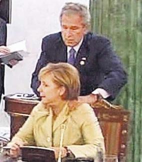 … Merkel converses with her neighbor at the table, does not notice how Bush is approaching from the rear …